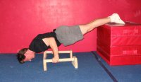Best done wearing socks or shoes. Start in a push-up position on the parallettes but with your feet pointed so the tops of your feet are resting on the floor. Lean forward as far as you are able to maintain control. Lower yourself into the bottom of the push-up, allowing your shoulders to come down well in front of your hands. Push back up. As you gain strength in this exercise you will find that your feet will start to come off the floor. The ultimate example of this exercise is when your feet never touch the floor.
