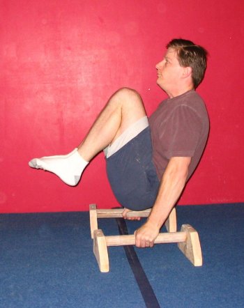 A V-sit is an L-sit except that your legs are raised to the point where they are 45 degrees or more above horizontal. This skill requires and develops intense compression of the abs and flexibility in the lower back and hamstrings. Moreover, because the skill requires you to lean back and push your hips forward, it is an excellent stimulus for the triceps. To start working toward a V-sit, hold a tucked support with your knees as high as possible, then straighten your legs. Yes, the quad cramping is normal. It will go away in time. Once you are able to go from a tucked support to a V-sit and hold it for a few seconds, you can start working on lifting your legs from an L-sit directly into a V-sit.