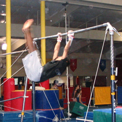 Start the swing by hanging in an inverted pike under either a single bar or parallel bars. (You will be hanging with straight arms, chest facing the ceiling, completely folded at the hips, with your knees in front of your face.) In the case of the parallel bars, your hands should be on the inside of the bars, turned out (pronated), thumbs pointing forward. This grip will allow the swing to travel above the bars. Initiate the swing from your shoulders. Push the bar(s) forward and backward as hard as you can without bending your arms or allowing your legs to drop either forward or backward. Initially maintain as tight a pike as you possibly can and try to keep your legs parallel with the ground. Try to feel the period of the swing and add pressure to increase the swing as you are able.